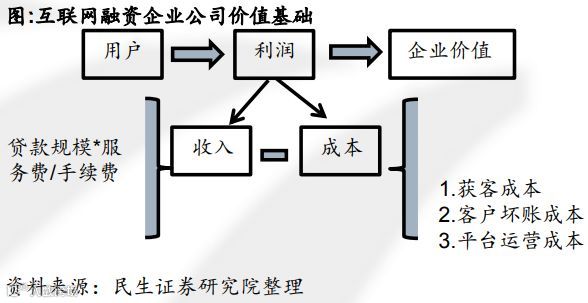 融资企业:消费信贷,网贷平台,金融超市。三者的盈利模式、贷款规模、发展历程均存在差异。但三者均是融资业务,核心点均是:贷款量(利润来源)、费率差(贷款费率-融资成本差)、风控(资产质量情况)。