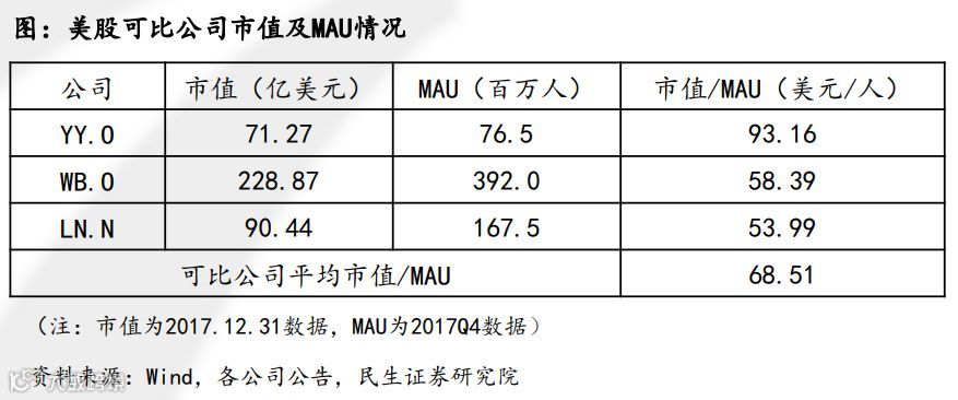哔哩哔哩(BILI.O)于2018年3月28日在美国纳斯达克上市。我们选取了欢聚时代、微博和LINE三家美股公司作为哔哩哔哩的可比公司,并计算了这些公司的市值/MAU。
