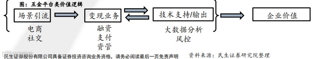 平台综合类企业:常覆盖上述全部或部分业务,多是互联网巨头布局金融业务的产物,通产由场景引流结合变现业务(以电商、社交场景为基础,开展支付、融资、资管业务),数据收集/沉淀(利用业务数据作为风控和定价基础),技术支持/输出(利用企业自身技术优势,开展金融创新,运营维护)等部分组成。例:蚂蚁花呗=支付+融资业务。