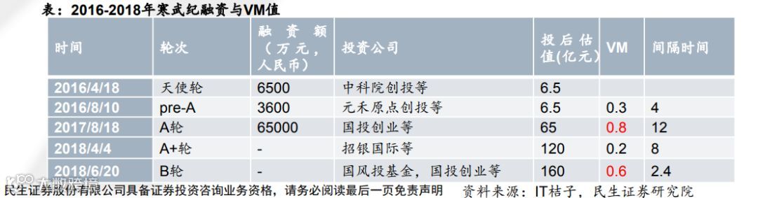 目前寒武纪VM指数看,17年和18年融资都出现VM超过0.5的情况,考虑到麒麟970出台量在17年有大幅度增长,以及18年公司研发出性能功耗全面超越CPU和GPU的MLU100机器学习处理器芯片,导致公司估值上升较快。