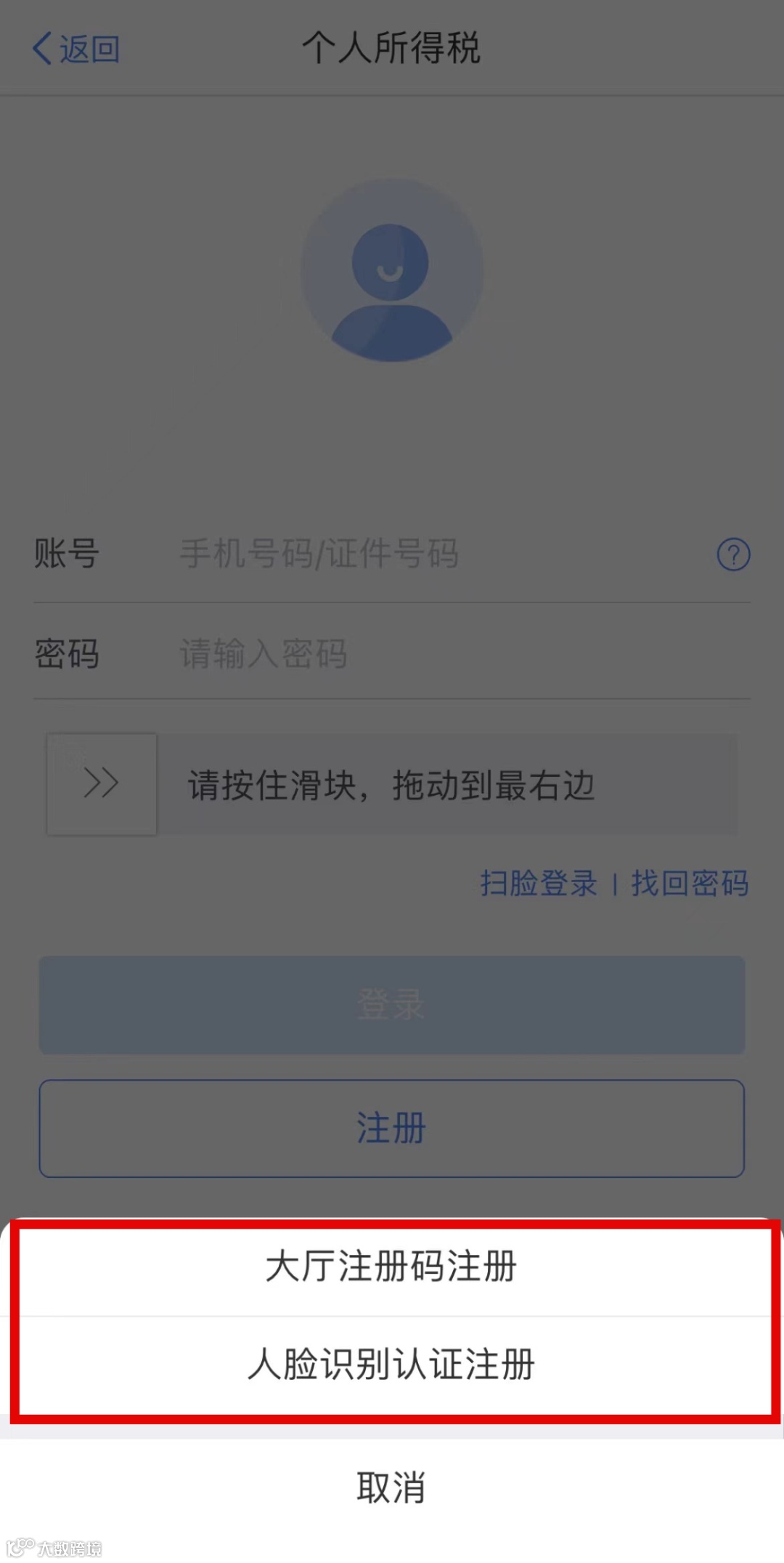 如果是首次使用个人所得税APP,需要先注册。操作也很简单,可以选择大厅注册码或人脸识别认证注册,然后按照提示录入相关信息即可。