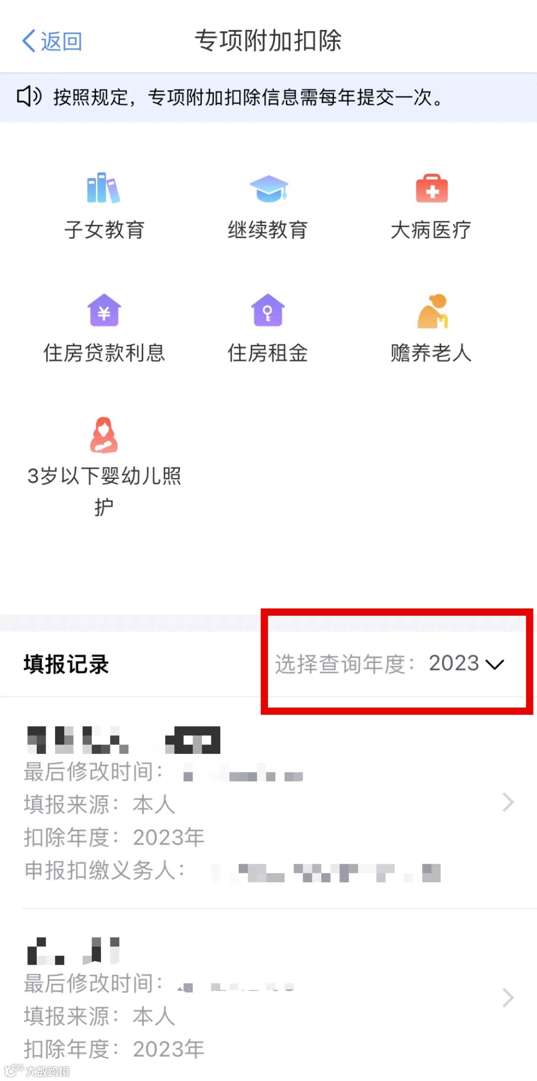 在“汇算准备”页面点击【专项附加扣除信息】,在“年度”栏选择【2023】,如发现存在错误可点击【修改】进行更正;如有漏填,可点击对应专项附加扣除进行补填。