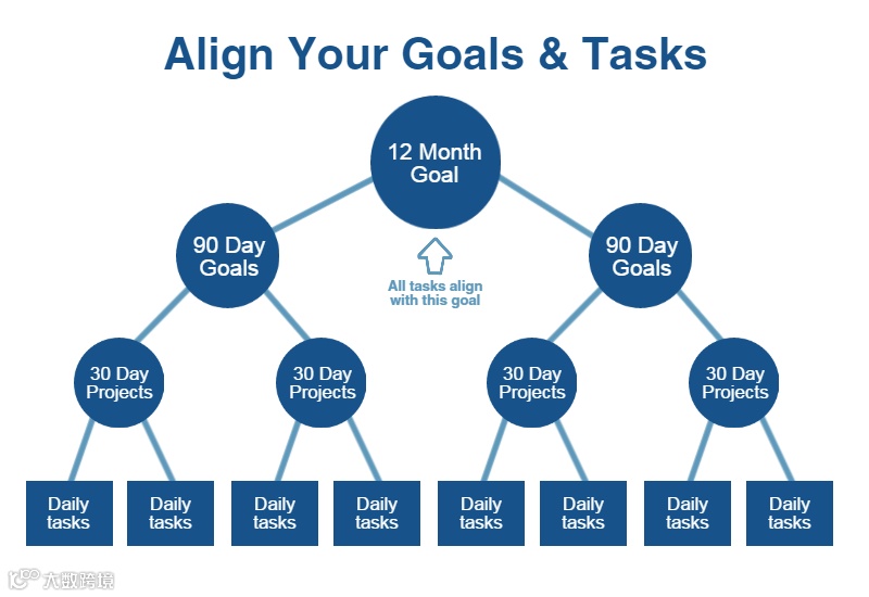 目标——列出行动步骤——每天执行——经常修正。整个流程如图: