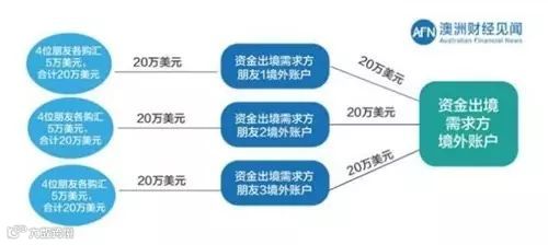 需要向海外转移资金的需求方请三位亲友分别在境外开设银行账户,三位亲友再分别邀请四位朋友(避免法规中不得超过5人的监管要求)各购汇5万美元以下,总金额不超过20万美元,汇到三位亲友的境外银行账户,这样一来,三位亲友每人境外银行账户中都可以累计近20万美元,合60万美元。再将三个境外银行账户中的60万美元转移到需求方海外账户,便可用于海外投资之用。