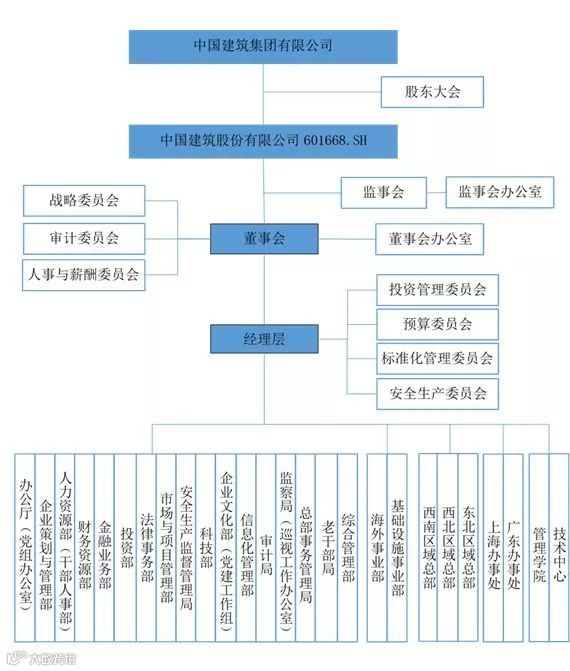 建筑央企在组织架构方面区别于民营企业的主要是设置了党委会等相关组织,另外由于建筑企业生产特征,均会单独设置安全监管部门和