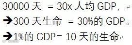 假设生命的价值按照30倍的人均GDP来计算,人的一生按照80岁约等于30000天来计算。