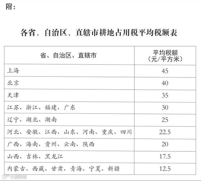 图表:各省、自治区、直辖市耕地占用税平均税额表