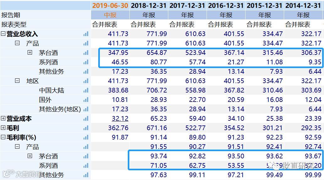 上图是原始数据,我们还可以制作结构报表和趋势报表,可以直观的得知系列酒增速要高于茅台酒,占比在逐渐提高。之前文章中,我们系统梳理过茅台的产品线,茅台酒受制于基酒产能限制,而出厂价提升市场反应敏感,需要根据市场环境和消费者的接受程度缓慢提升,增长幅度有限。那么主要增长因素在系列酒和非标酒的增长。所以在具体财务预测当中,非标酒及系列酒是主要增量因素,需重点分析。