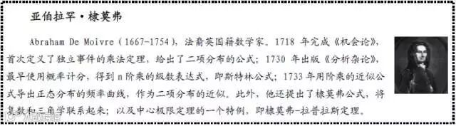 亚伯拉罕•棣莫弗利用微积分和帕斯卡三角形的内部结构—后被称为二项式定理,显示了一组随机抽取的样本是如何分布在它们的平均值周围的。棣莫弗所研究的分布,现在被称为标准曲线,或者因为它的曲线的形态像个钟,所以又被称为钟形曲线。当被描绘为一条曲线时,这个分布显示了大量的观察结果集聚在中心周围,接近观察总数的平均值。然后,这条曲线的两边对称地向下倾斜,每边有相同数量的观察数量;开始时曲线下斜的角度比较陡峭,到末端时趋于平缓。换句话说,离均值远的观察值出现的频率比离均值近的观察值出现的频率要高。