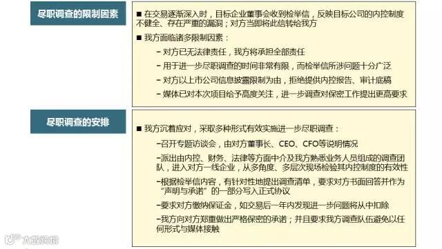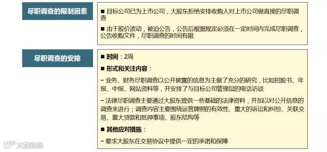 尽职调查就其范围而言需对公司的业务、财务、法律等各方面作全面的评估,从而降低交易的风险,减小交易的成本.