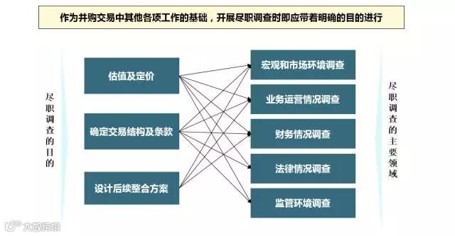 买方和卖方之间存在着信息不对称,买方所获得的信息也是不完备的,尽职调查可以减少这种信息的不对称,尽可能地降低买方的收购风险;尽职调查的结果和买方对风险的承受能力可能决定了并购是否能继续往前推进;尽职调查的结果也是买卖双方估值讨论的基础;尽职调查也是买卖双方知己知彼从而编制合并后合作业务计划书的基础。