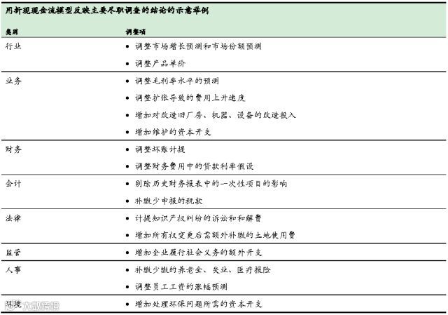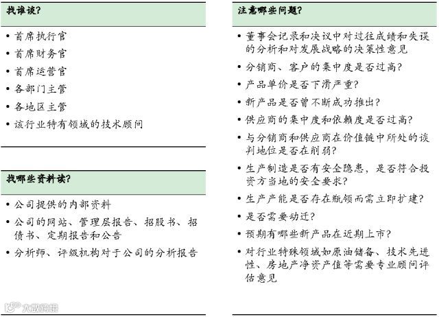 理解公司业务和运营的各主要方面,从侧面验证公司的优势和不足以及公司发展战略的有效性,对兼并收购后所能产生的收入和成本等方面协同效应作估计。