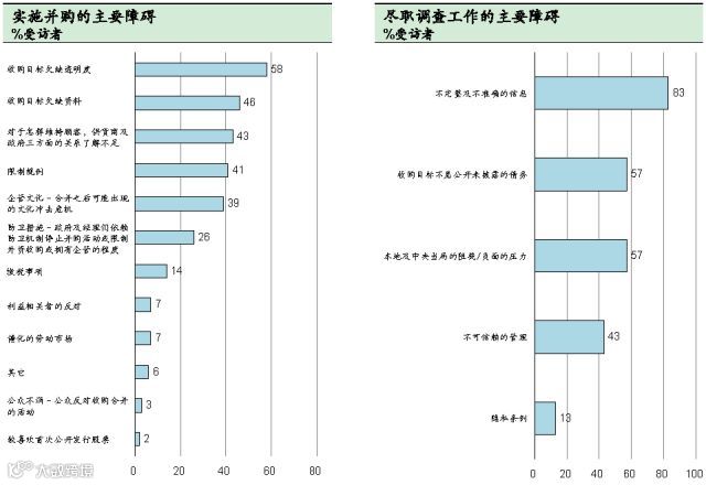 《经济学人信息部》近期的一项对中国并购近况的调查显示目标企业缺乏透明度以及缺少目标企业的相关信息是实施并购的主要障碍;而尽职调查工作方面存在的主要的障碍在于信息不完整不准确及收购目标未披露债务实际情况;调查显示外国企业更多地依靠对目标企业开展尽职调查工作来发现其存在的不足和问题,这也正是它们如此重视并购进程中这一环节的原因,而中国企业的管理人士则把资产估值资料不准确甚至是存在水分视为普遍存在,对比他们并不感到意外,也不会在尽职调查方面花太多时间;事实上,提高透明度,尽可能提供完备的资料是降低双方交易成本,提升交易成功机率的最有效的方法。缩小在尽职调查上的东西方文化差异有别于进一步促进跨国并购活动的蓬勃发展。