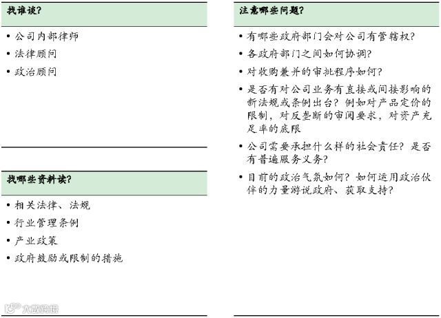 理解公司所处的政治和监管环境,理解兼并收购所涉及的审批程序,以便及早开展游说工作、获得支持、降低获准审批的不确定性。