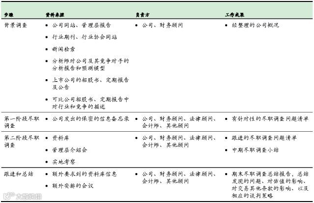 尽职调查的流程主要包括:背景调查、两阶段的尽职调查以及跟进和总结.