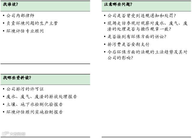 评估公司所面临的环保问题,确保公司没有违反环保条例,确保公司不会受环保问题导致的诉讼;清理环保问题的成本可能是极其昂贵的,可能会导致公司的名誉损失,也可能导致歇业的严重后果。