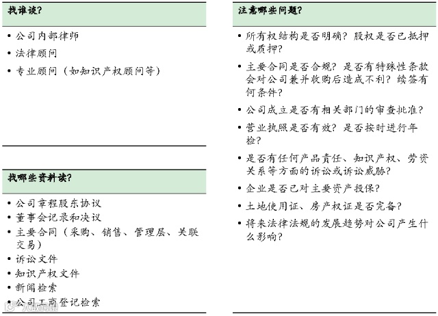 确保公司依法成立并拥有经营其业务的营业执照,找出任何实际的和潜在的法律诉讼;法律风险可能会影响财务(例如赔偿损失)甚至于直接影响业务(例如停业整顿或回收已销售产品等)。