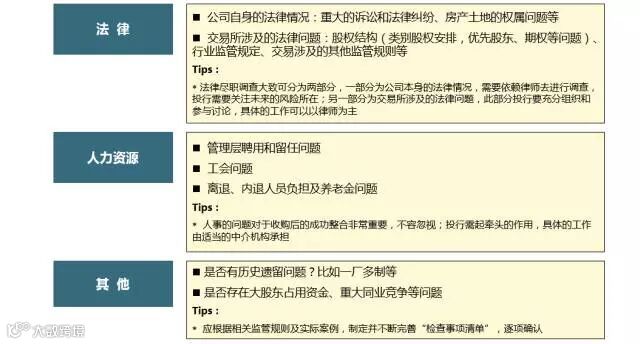 理解目前的人事制度、人力资源结构,确保没有对社保机构拖欠员工福利,提前为兼并收购带来的人事变动做好准备。