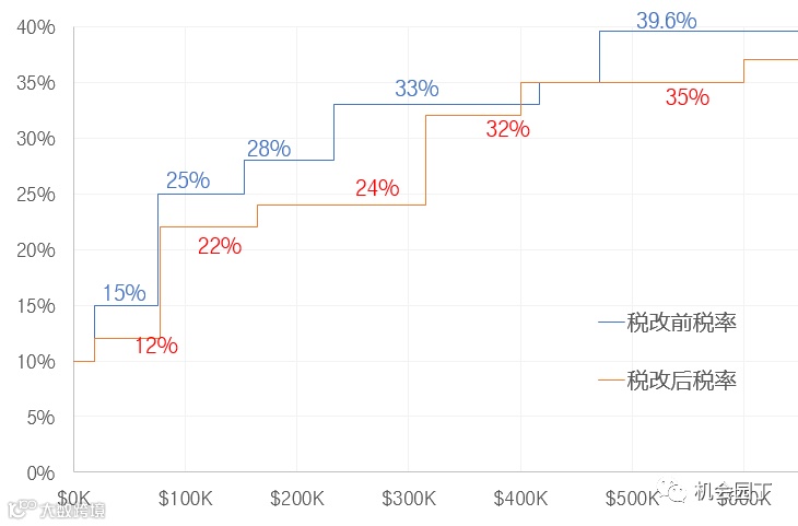 下面图示夫妻联合报税(married filing jointly) 的税改受益。横向是应纳税收入taxable income, 纵向是税率。