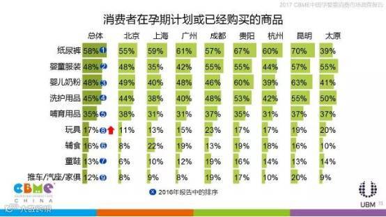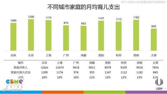 在城市家庭育儿月均支出统计中,北京以1209元的月均支出占据榜首,太原、成都等二线城市则在800-1000之间;在宝宝0-3岁期间,纸尿裤、奶粉、辅食是复购率最高的产品。