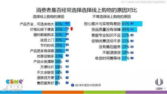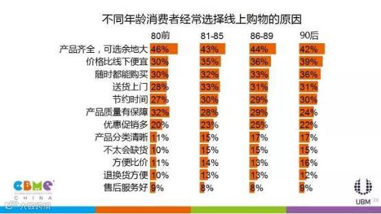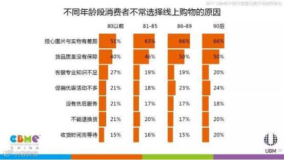 不同城市的消费者选择线上购物的初衷也有较大差别,北京、成都的消费者更关注线上的价格比线下便宜,上海、广州的消费者更认可线上的产品齐全,可选择余地大;相比80后、90后,80前用户相对不太关注心线上的图片与实物是否有差距,他们更关心客服的专业知识是否充足,能够给到相应产品的意见或建议。
