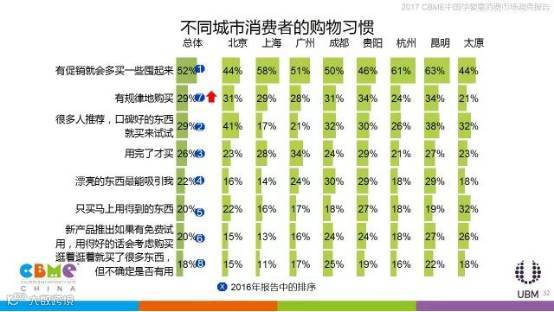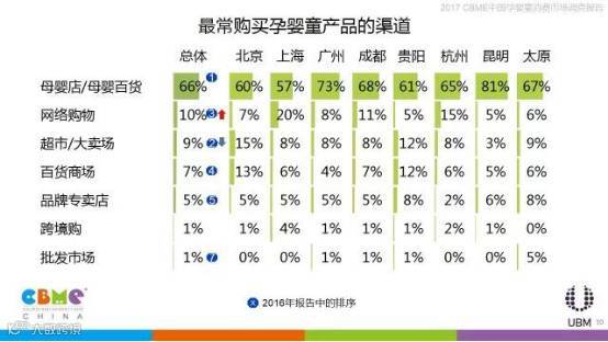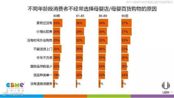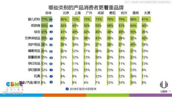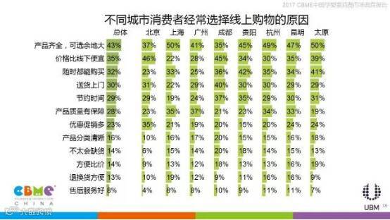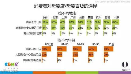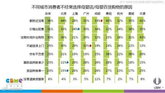 相比其他年龄的消费者,90后妈妈更关注家附近是否有母婴店,也更关心产品的价格;上海、广州、贵阳、杭州、昆明、太原的消费者在线上购物时更看重产品是否齐全,北京、成都的消费者更看重价格是否比线下便宜。