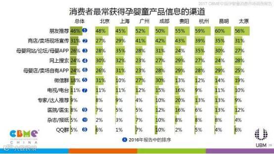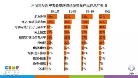 相比其他人群,母婴消费者更信任朋友的推荐,占比高达46%,80后、90后的年轻妈妈更愿意通过朋友获取信息;此外,商店、卖场现场宣传占比也达到31%。