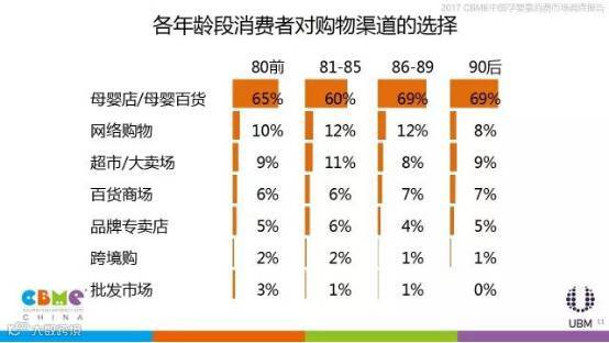 从母婴产品购物渠道来看,传统的母婴店、母婴百货占据了大部分份额,总体达到了66%,网络购物呈上升趋势,占比达10%;针对不同年龄,85后、90后更愿意在百货商场购买母婴产品,提供购物、美食、游乐的一站式服务的综合型商场更受年轻人的喜爱。