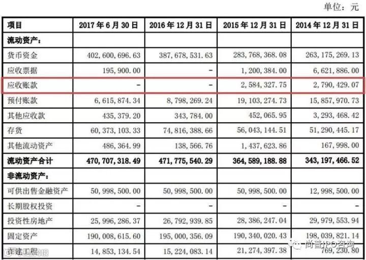 威尔曼最让人讶异的是应收账款2016年末、2017年6月末均为“零”。而2016年营业收入4.22亿余元、2017年1-6月营业收入2.27亿余元。