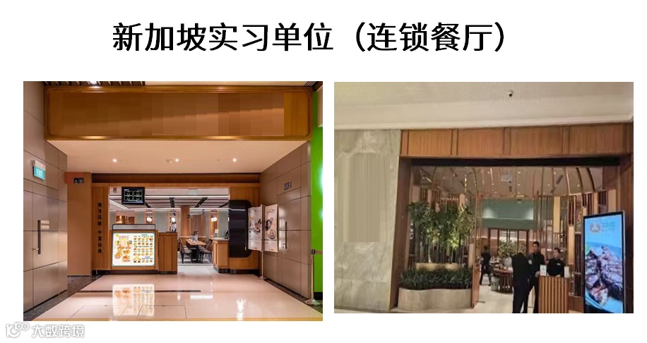 实习工作单位:新加坡星级酒店、大型连锁品牌和高级餐厅