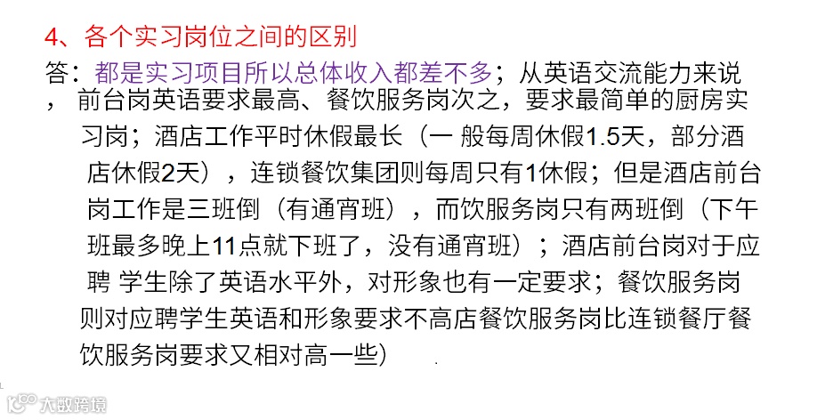 实习工作时间:每周工作44小时或根据当地类似工种的标准安排,若工作需要超时则计算加班费;但每周至少保证享有一天的休息日(酒店实习生每周享有1.5天休息)