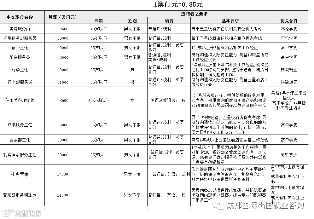 招聘职位:房务员、前台服务员、前台主任、行李生、行李主任、休闲美容理疗师、环境服务主任、管家部主任、礼宾管家、礼宾管家服务主任、管家部服务调派员