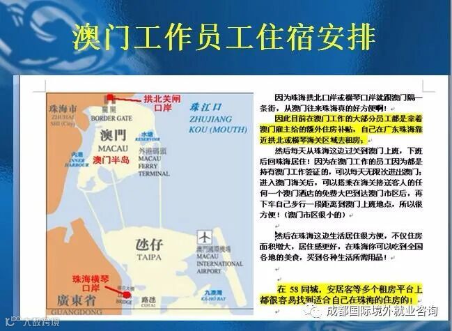 4.住宿:给予所有员工每月提供400元人民币住房补贴 (目前澳门工作员工一般都与同事在澳门街对面的珠海市合租,然后每天从珠海过海关搭乘穿梭于海关到澳门购物中心所在酒店的免费大巴上下班)