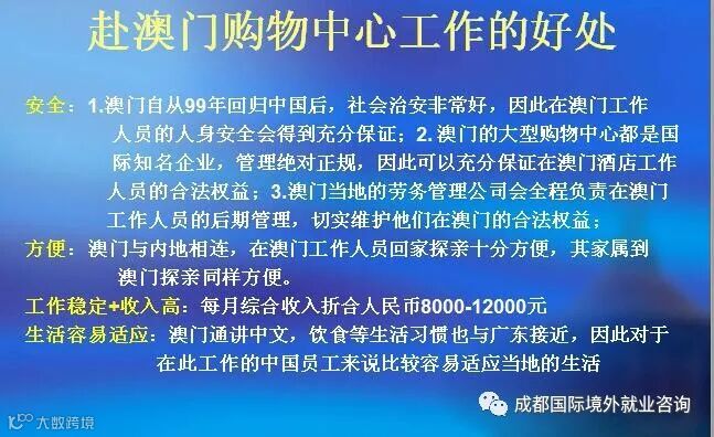 3.上下班交通:给予每天提供交通补贴8元人民币(但是员工如果住在珠海,每天实际可以在澳门海关搭乘穿梭于海关和澳门购物中心所在酒店的免费大巴上下班)