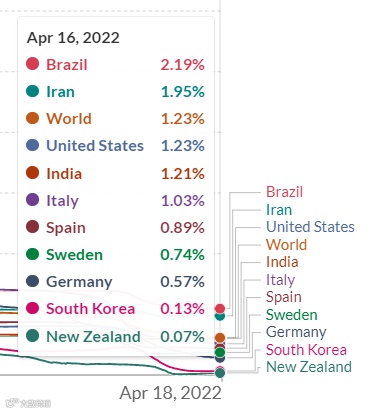 这个0.03%死亡率是全世界最低之一,截至4月16日,世界平均新冠病例率为1.23%。