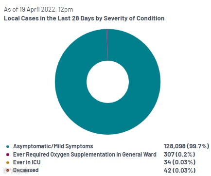 截至到4月19日,过去28天中,99.7%的人为无症状或轻症,需要进ICU的重症患者为34人,占确诊病例的0.03%,因并发症去世的为42人,约占0.03%。