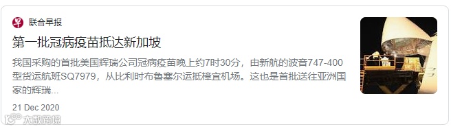 早在2020年12月21日晚,第一批辉瑞疫苗已经抵达新加坡。
