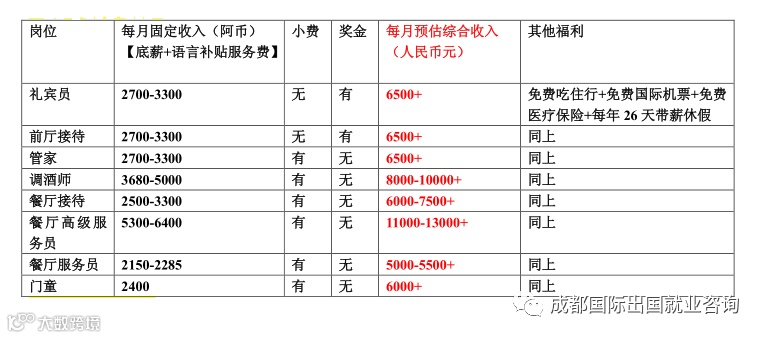 待遇:每月底薪5500-7000阿币(折合约人民币10000元-13000左右)+销售提成(根据销售业绩,每月销售提成从3000元-10000元人民币不等)+免费往返国际机票+免费医疗保险+每年30天带薪假休假+优秀员工将获得年终小汽车奖励和免费到欧洲豪华邮轮旅游奖励