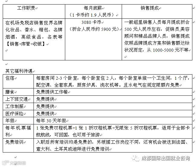 卡塔尔是中东海湾地区石油天然气能源富国,依靠石油天然气美元积累了大量财富,人均GDP排名世界第一;卡塔尔国际机场,隶属于卡塔尔航空公司的国际级机场,是中东地区的航空枢纽,由于处于亚非欧三洲结合地,因此每年大 量的国际航班在此转机,带来了世界各地的旅客资源,尤其是越来越多的中国 旅客;而其机场免税店更是云集世界各种奢侈品和各种高档商品,包括各种名 牌的化妆品,香水,箱包,食品,烟草,电子设备,名表等,且因为免税,价格比世界其他地方相对便宜,因此吸引包括中国游客在类的全球游客在卡塔尔机场免税店疯狂购物。为此卡塔尔机场免税店每年都会来中国招聘会讲英文的中国销售人员。