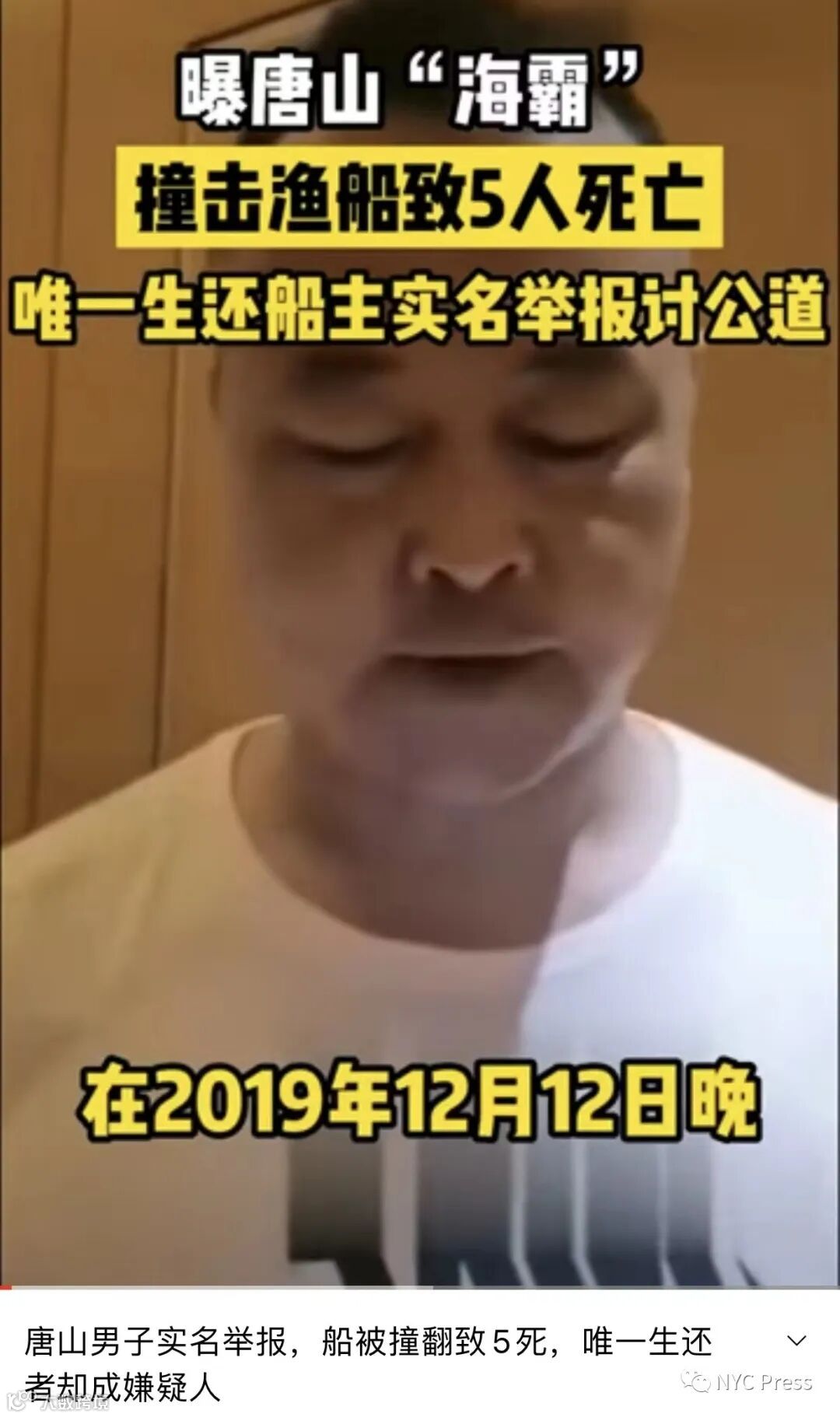 6月12日,实名举报人李红军称,2019年12月12日晚,在唐山市滦南海域,遭到海霸袭击,“被两艘渔船追赶,被其中一艘船,连续追赶撞击,将我所开的船撞翻,导致5名人员死亡”,李红军是唯一的生还者。