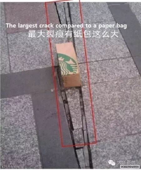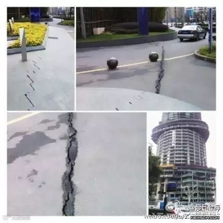 亚洲第一高楼——上海中心大厦在修建过程中,附近地面出现了一条可怕的裂缝。在2012年2月份,一名网友在跟上海中心大厦一街之隔的、101层楼高的上海环球金融中心附近拍到一条七米长的裂缝。(网络图片)