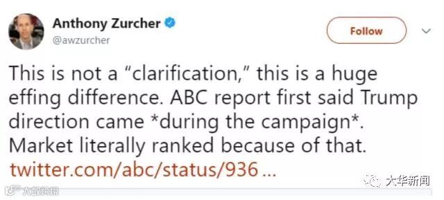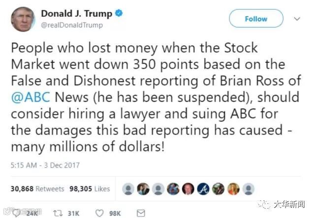 川普本人就更拽了,他说:那些因为ABC的假新闻而在股市上赔了钱的股民们,我建议你们找个律师起诉ABC赔偿你们数以百万计的损失!