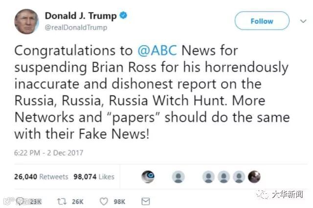 再然后,ABC把炮制假新闻的资深调查记者Brian Ross停职。川普则趁机火上浇油:你们都应该把这种炮制假新闻的记者停职!