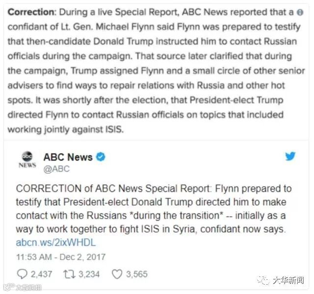 ABC新闻网在其官方账号上发布了一个“更正信息”,称那位“了解调查的知情人士”刚刚对ABC特别澄清说弗林“不是在川普竞选总统期间被要求联系俄罗斯人,而是在川普赢得大选后准备宣誓就职的这段期间”,至于川普让他联系俄罗斯人的原因则是为了共同对抗盘踞叙利亚的恐怖组织伊斯兰国。