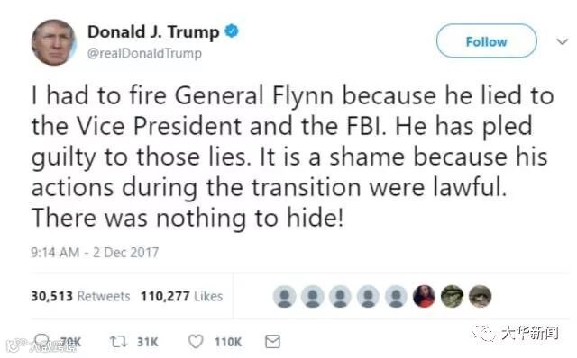 稍等片刻,看看事件回放:周六,美国媒体突爆猛料,称川普的前国家安全顾问弗林(Michael Flynn)已经承认此前对美国联邦调查局(FBI)撒谎:隐瞒自己在川普于去年年底当选总统后,要求他和俄罗斯官方进行过沟通的事情。
