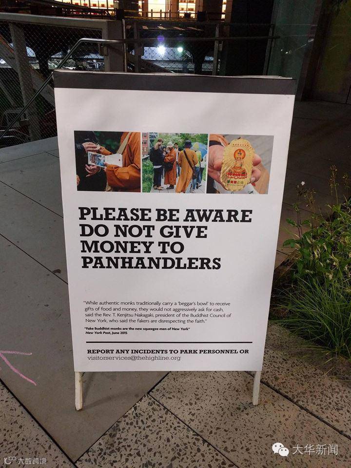 2016年6月20日,因接到很多投诉,纽约高线公园不得不在洗手间等地贴出海报和警示牌,提醒游客不要给这些假和尚钱财。管理人员表示,这些海报很管用。虽然假和尚没有因此减少,但是上当受骗的人少了。