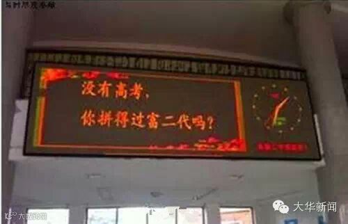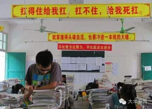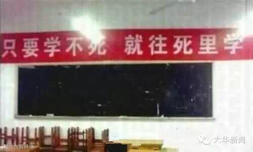 ①不苦不累,高三无味;不拼不搏,高三白活;②要成功,先发疯,下定决心往前冲!③提高一分,干掉千人!④没高考,你拼得过富二代吗?⑤我拼命,我怕谁?⑥只要学不死,就往死里学……或励志,或雷人。近日央视新闻在微博上整理了那些谁的高考都伴随过的标语。