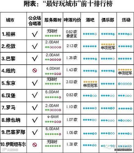 研究依据餐厅、酒吧、成人娱乐、博物馆、购物中心、啤酒的价格和各项服务关门的时间等标准,比较了总共1800座城市。