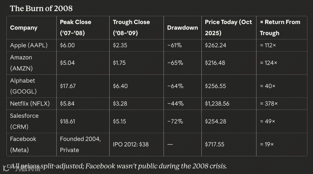 Apple 将逆境转化为主导权,将 iPhone 从新奇产品推广为文化基础设施。Amazon 在经历了互联网泡沫的炼狱之后,成为了互联网氧气的安静供应者 ——AWS。Netflix 为流媒体时代进行了自我革新,其增长几乎跑过了前一个泡沫铺设的光纤。Salesforce 证明,即使资本预算枯竭,云软件也能繁荣发展。Google 发现,可衡量的性能广告甚至在经济衰退中也能扩张。而当时还是一颗幼苗的 Facebook—— 很快在灰烬中扎根,由廉价的智能手机和过剩的带宽滋养。