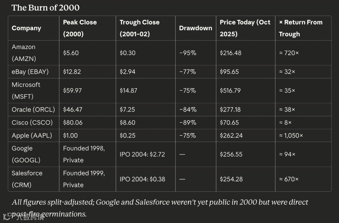 Amazon 看起来死了 —— 下跌 95%—— 但最终成为电商业的支柱。eBay 早期稳定并成为第一个盈利的平台市场。Microsoft 和 Oracle 将其软件垄断转化为持久企业现金流。Cisco 被产能过剩烧焦,随着网络成为商业的 “管道”,而缓慢重建。